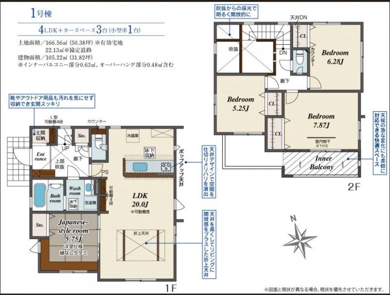 | 土地面積 | 166.56㎡ / 50.38坪 | 建物面積 | 105.22㎡ / 31.82坪 |