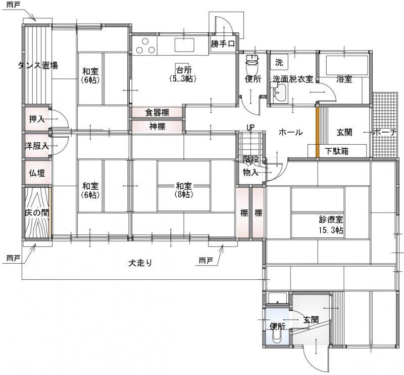 ● 間取りは、5K+診療室です。 ● 以前は、自宅と接骨院でした。 ● 店舗部分の面積は28.98㎡・8.76坪です。 ● 店舗部分を居住スペースに変更できますし、様々な店舗としてもご利用できます。 ● 駐車場は、並列駐車で5台可能です。 |